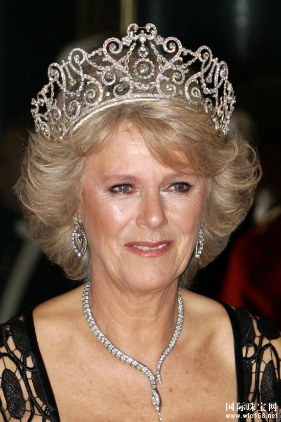 还有就是这顶the Delhi Durbar Tiara王冠,它是1911年由**制作的,玛丽王后在1922年用小钻石替换了王冠上原有的绿宝石。后来这顶王冠也是传到了伊丽莎白女王的手里,不过伊丽莎白女王似乎从未戴过,现在主要是给卡米拉使用。虽然很多人不喜欢卡米拉,但这顶王冠确实好看。