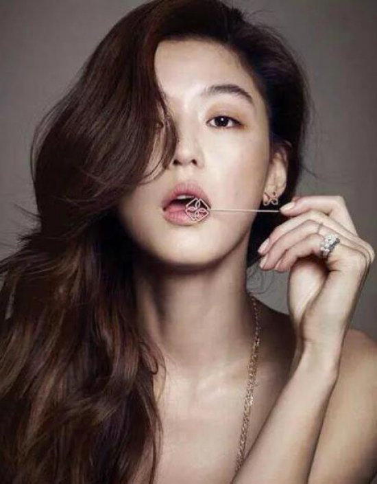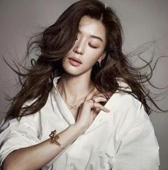 图中全智贤上身穿着一件白色衬衣,衬衣的款式比较常规,它具有比较常见的v字型领口,胸前是一排白色的透明纽扣。这样的设计带有些许的复古,外表看起来又很小清新。她的手臂上戴着一支玫瑰金质地的手镯,这只手镯的表面有一个较大的团图案作为装饰。这个图案是半镂空式的,这样的外观设计比较抢眼。