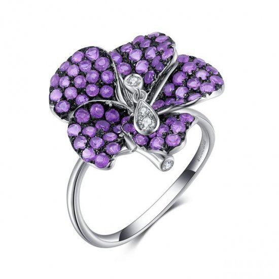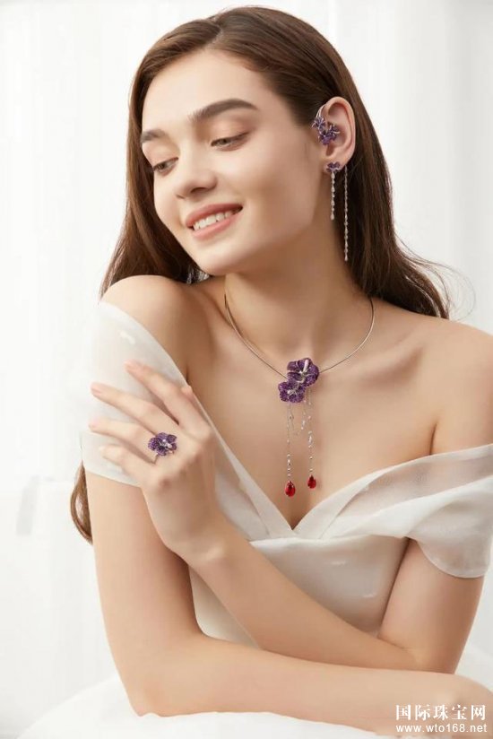 木槿花系列以胸针、戒指、项链及AB款耳饰组成,全套产品共有9朵木槿花,每一朵木槿花均以88颗赞比亚紫水晶镶嵌,代表“∞”,象征着无穷无尽、生生不息的含义。