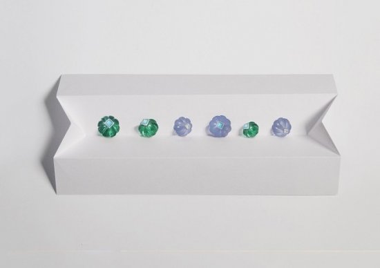 这组套装由项链、手链、戒指和耳坠组成——*醒目的戒指作品突出2种宝石的色彩对撞;项链和手链则由刻纹宝石珠连缀而成,隐蔽镶座结构让宝石如同悬空于白金项链,黑色缟玛瑙、蓝宝石和绿松石构成的几何元素重叠形成巧妙繁复的视觉效果。