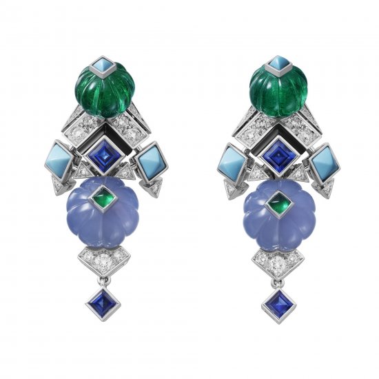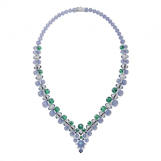 「水果锦囊」(Tutti Frutti)是 Cartier 的标志性设计之一,灵感来自印度雕刻宝石传统工艺。新作尝试蓝色和绿色宝石搭配——使用蓝玉髓和祖母绿雕刻的装饰圆珠,色调清澈如晶莹的果实。